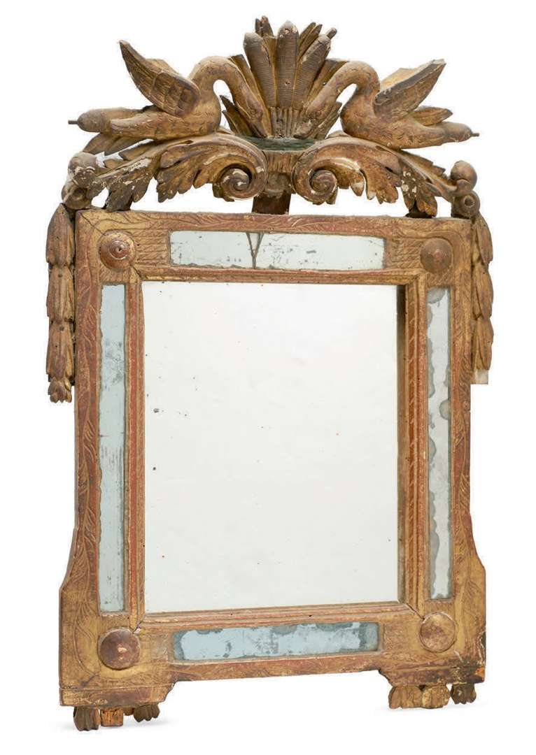 MIROIR AUX CYGNES à parecloses en bois sculpté et doré. Le fronton orné de deux cygnes affrontés fouissant devant des quenouilles de roseaux, posés sur des enroulements.