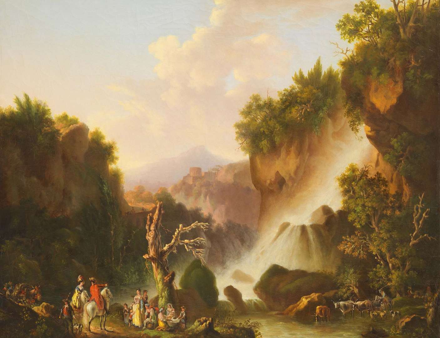 Importante tapisserie en laine et soie, d'après un carton de Jean-Baptiste Huet illustrant le jeu de Colin-Maillard, l'un des sujets de la tenture des Amusements Champêtres. Décor de trois personnages sur la droite s'amusant au jeu de cache-cache, deux personnages sur la gauche les observant. Une cascade au centre entourée d'une luxuriante végétation très colorée. Bordure à enroulements de fleurs et feuillages stylisés en polychromie.