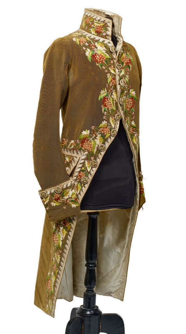 HABIT DE COUR À LA FRANCAISE en tissu vert de vessie. L'habit est richement brodé d'un décor de fleurettes violettes et feuilles et fruits de sureau en fils de soie polychromes. Frises de demi-aigrettes de pissenlit et filets beige et blanc. La broderie recouvre le col montant, les deux devants, le tour des poches et les pattes des poches et les basques. Neuf boutons brodés au devant et deux mêmes boutons par manche, trois par poche et deux à l'arrière. Doublure en sergé crème.