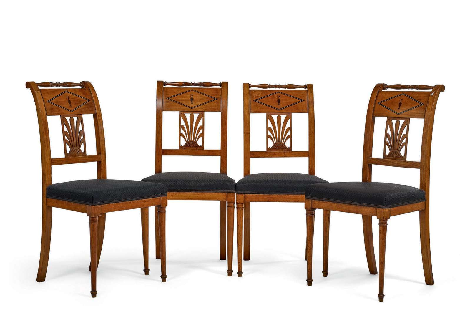 SUITE DE QUATRE CHAISES en placage de bois fruitier. Les dossiers renversés ornés d'une barette tournée en balustre et à décor marqueté d'une aiguière dans un losange surmontant une palmette ajourée. La ceinture droite repose sur deux pieds antérieurs fuselés et deux pieds postérieurs sabres.