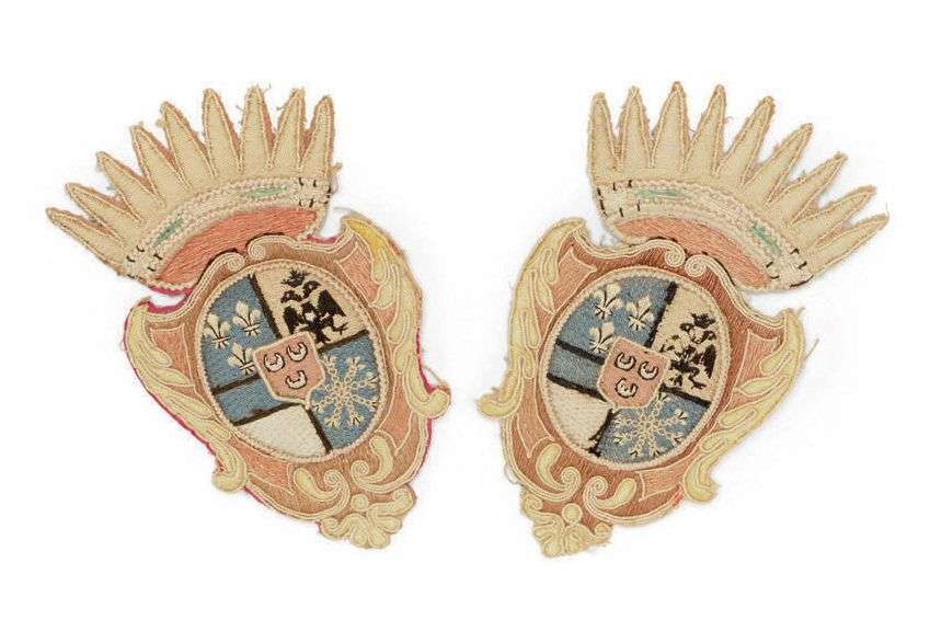 Écussons brodés polychromes et doublés papier. Écu de forme italienne sous couronne probablement comtale.