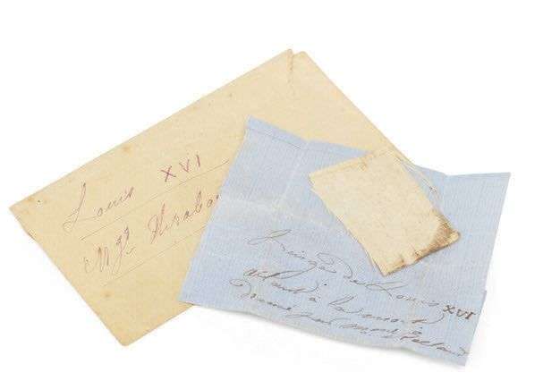 Fragment de tissu présumé en provenance de Louis XVI montant à l'échaffaud. Dans un papier bleu portant l'inscription manuscrite : « Linge de Louis XVI allant à la mort (donné par Mme Selland (?) ».