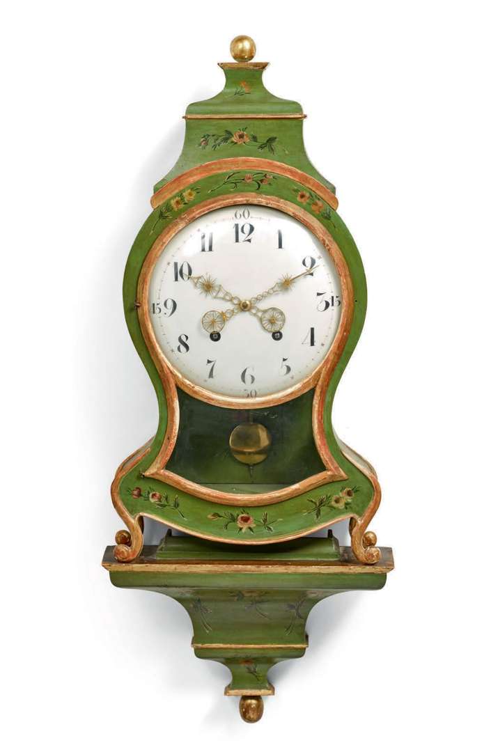 CARTEL DE NEUCHÂTEL et sa console d'applique en bois laqué vert. Le cadran