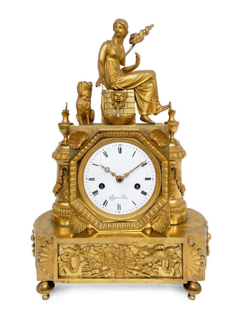 PENDULE À LA FIDÉLITÉ en bronze doré, le cadran émaillé blanc signé "Chopin à Paris" s'inscrit dans une caisse octogonale sous un groupe de bronze doré représentant probablement Ariane filant, un chien à ses pied. Probablement une allégorie de la Fidélité.