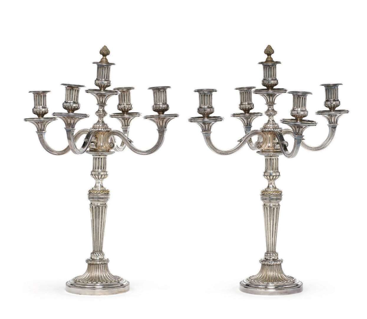 PAIRE DE CANDÉLABRES en métal argenté à cinq feux. Le fût cannelé et la base circulaire.