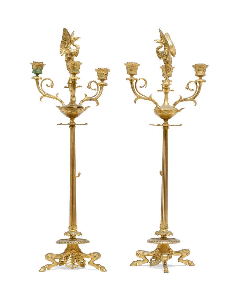 PAIRE DE CANDÉLABRES AUX HÉRONS à trois bras de lumière en bronze ciselé et doré. Les futs cannelés supportent des bouquets en forme de coupes à l'Antique sommées de hérons. Les piètements tripodes se terminant en sabots et alternant avec des palmettes ajourées. Signés F. Barbedienne.