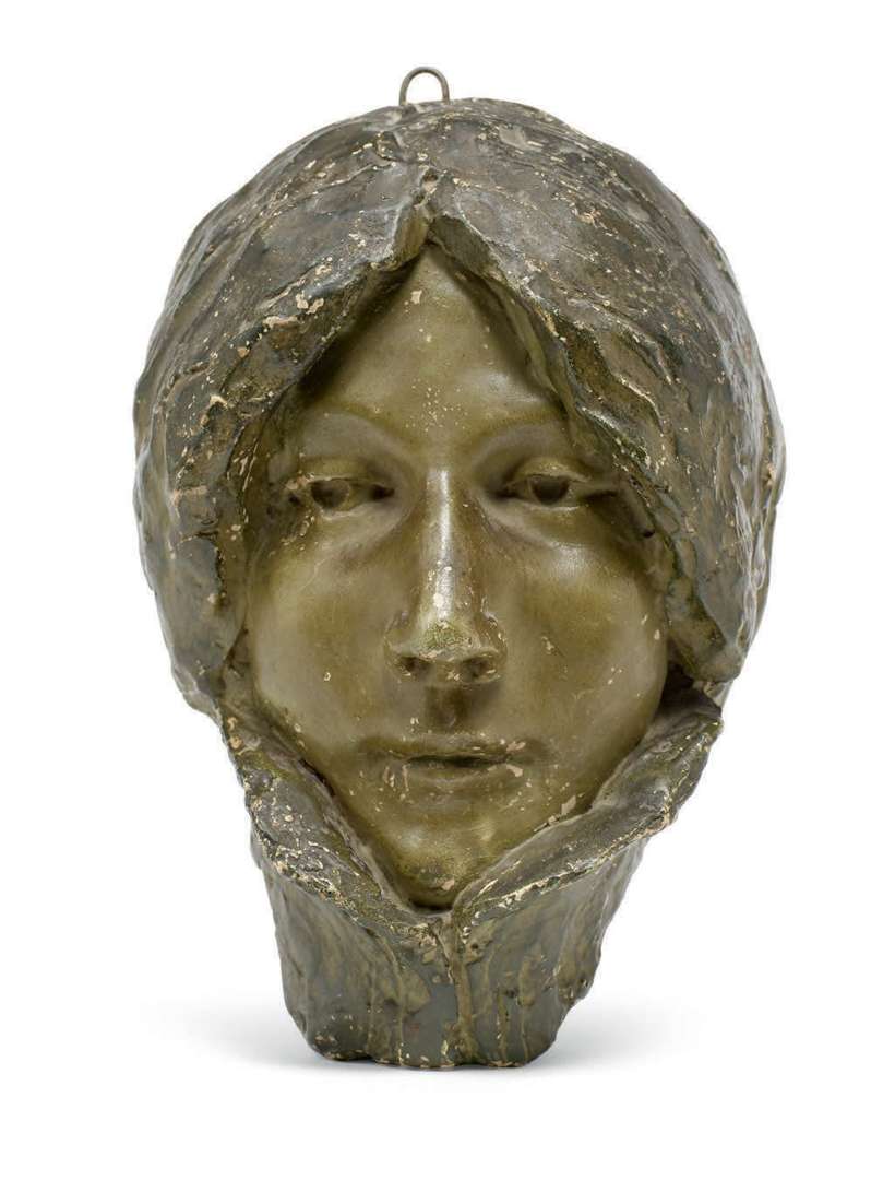 Masque de plâtre patiné vert à l'imitation du bronze.