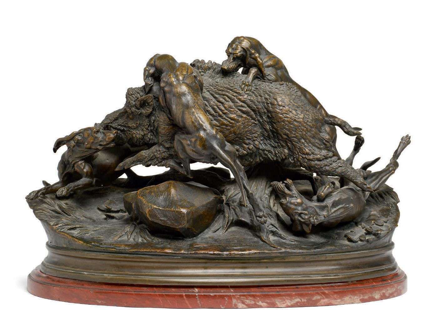 Sanglier attaqué par quatre chiens. Important groupe en bronze à patine brune. Signature en creux sur la terrasse. Sur un socle en marbre rouge veiné.