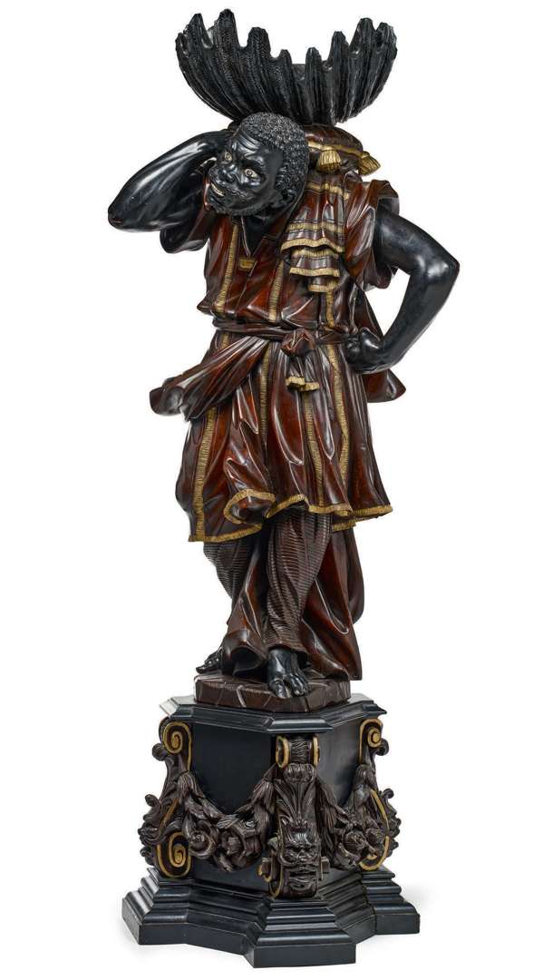 En bois sculpté et noirci. L'homme ployant sous le poids d'un gros coquillage de type bénitier.