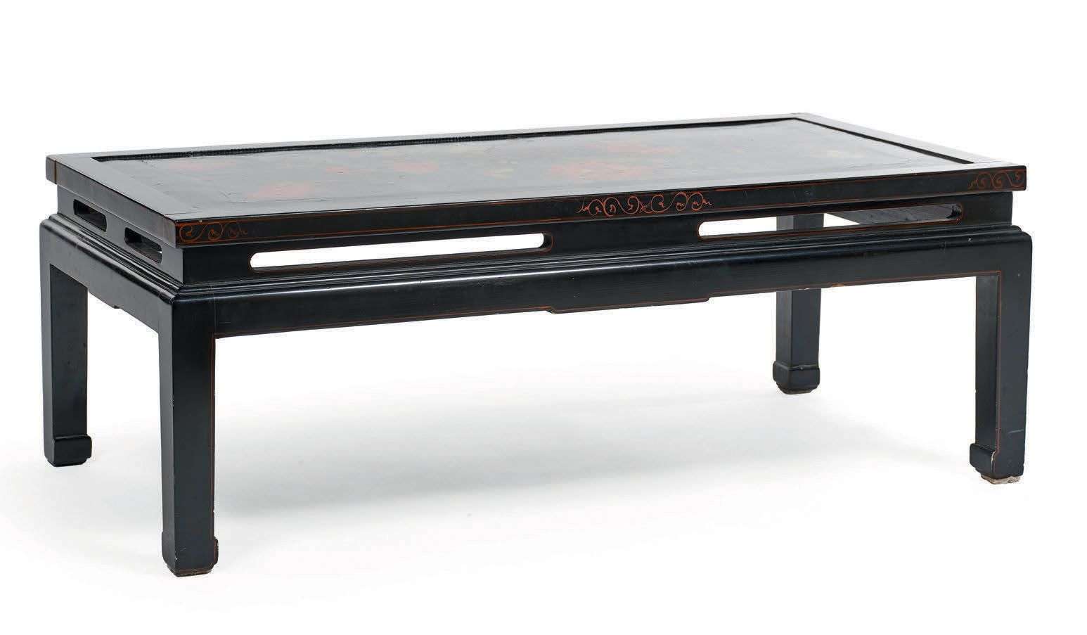DEUX TABLES BASSES CHINOISES à plateaux de forme rectangulaire. Décor pein