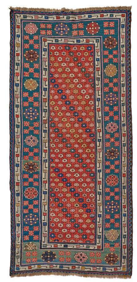 Velours de laine sur fondations en laine. Champ rubis à décor de semis de boutons floraux étoilés polychromes. Triple bordure dont la principale émeraude abraché à originale composition florale multicolore.