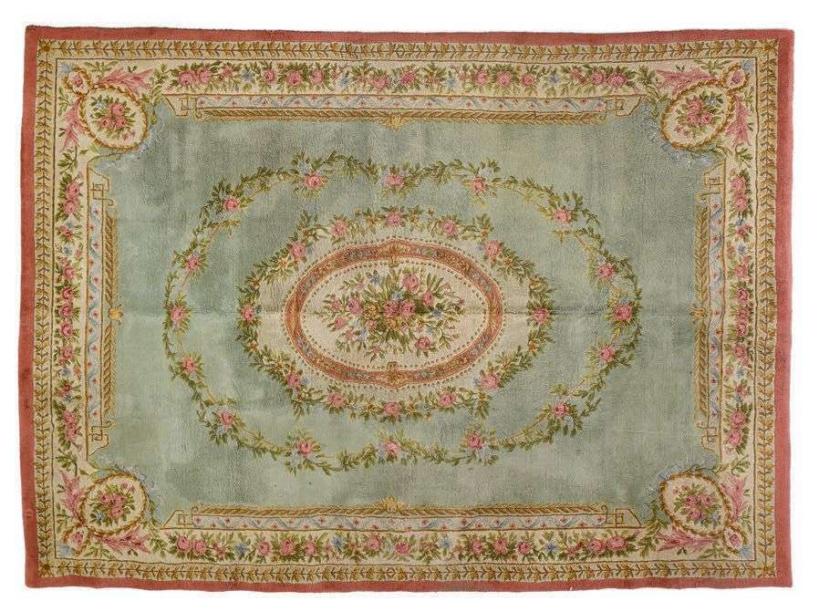 Velours de laine sur fondations en coton. Champ vert céladon à décor de guirlandes fleuries encadrant un médaillon central ivoire à couronne de fleurs et incrusté d'un bouquet floral polychrome. Bel encadrement formant la bordure ivoire à quatre écoinçons à réserves de gerbes fleuries et composé par un cordon floral.