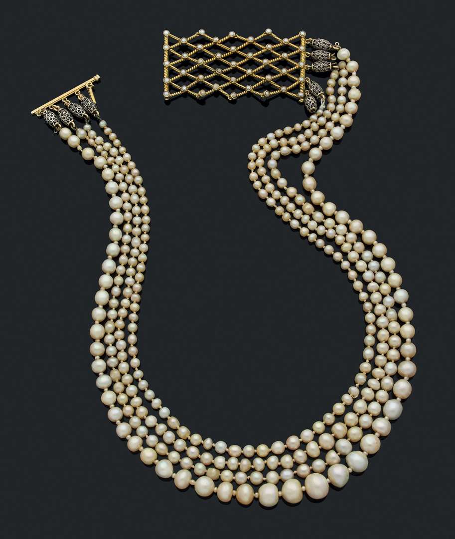 A four ranks of natural pearl, gold and silver necklace, certificate