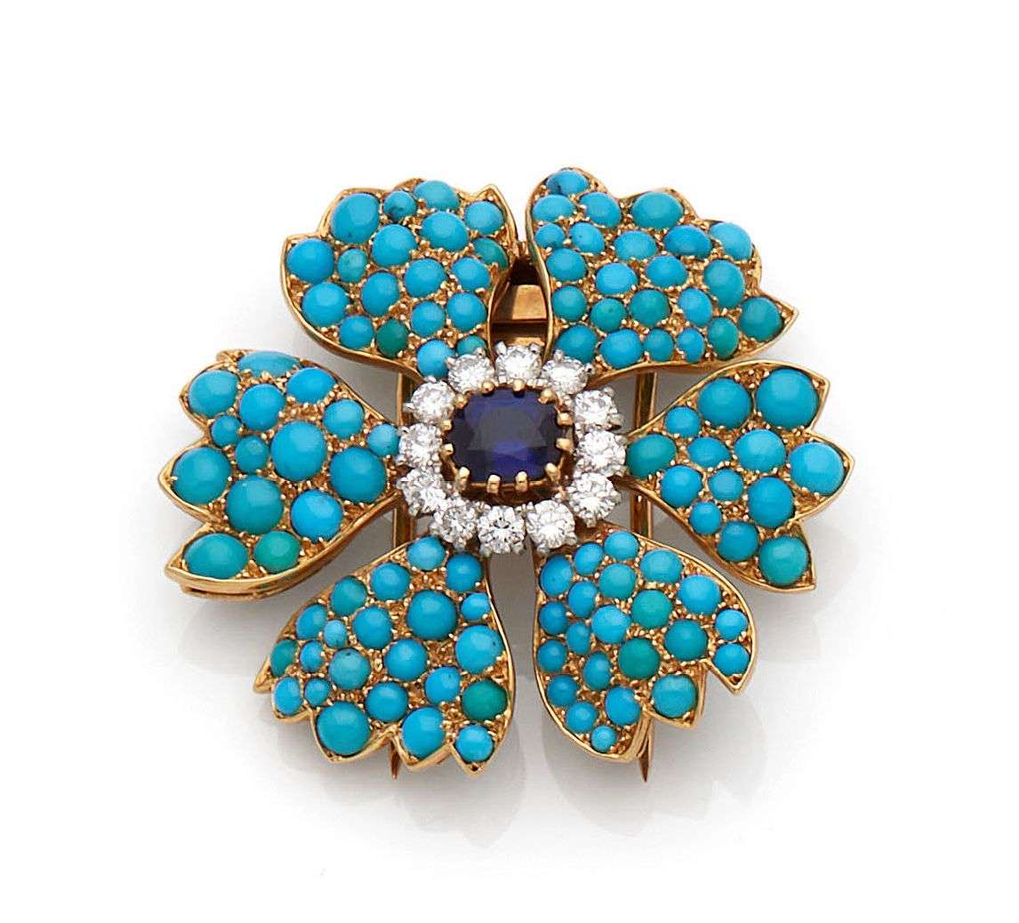 Cabochons de turquoises, saphir et diamants ronds
