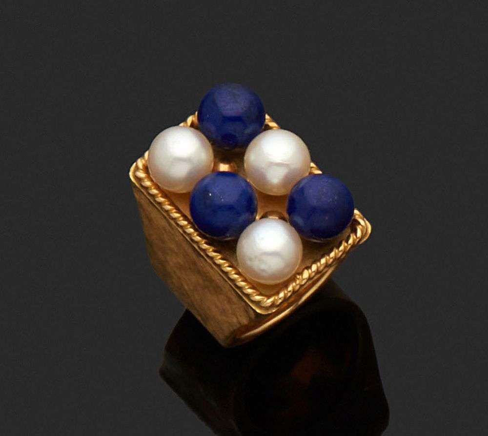 A lapis-lazuli, cultured pearl and gold ring