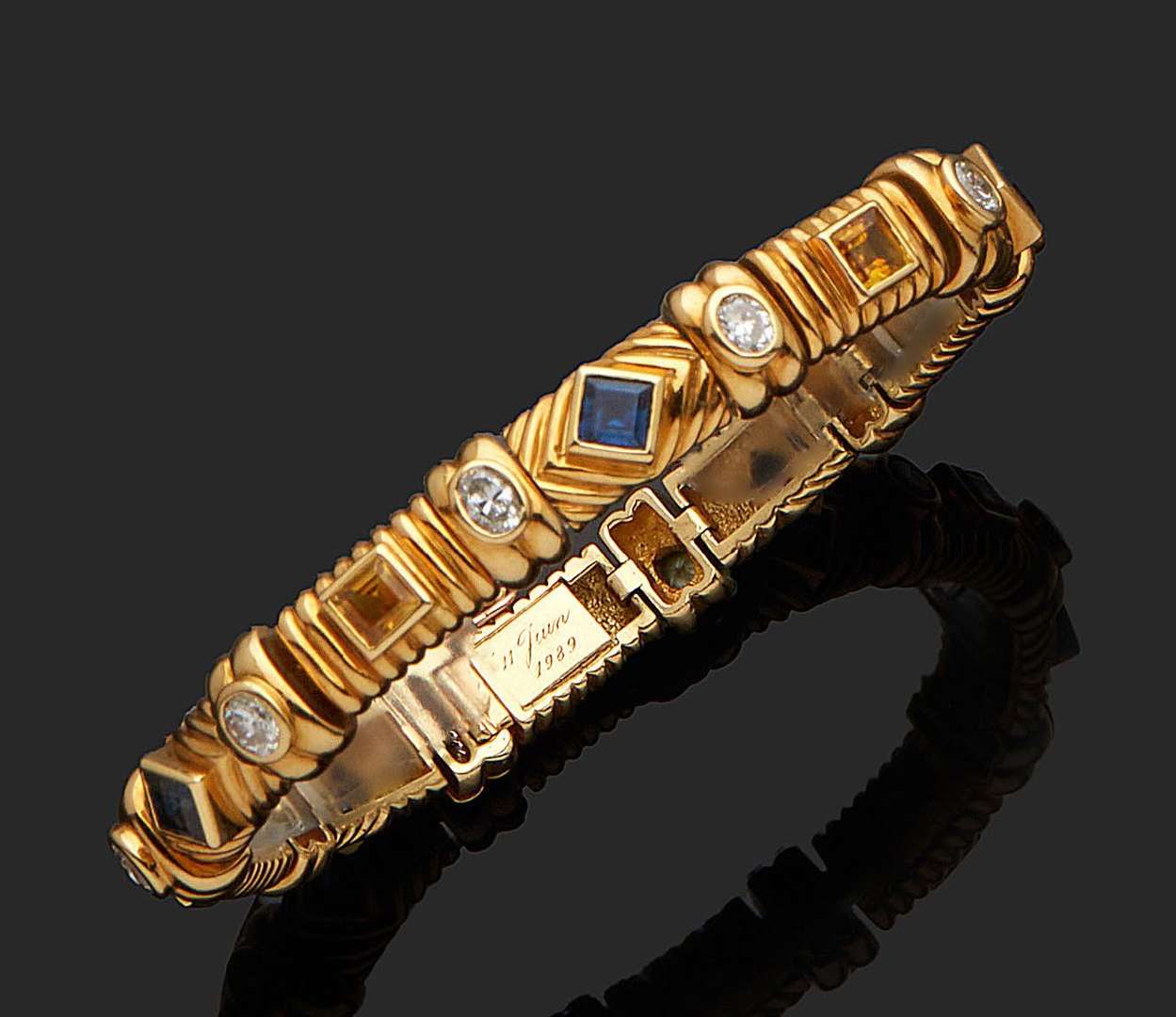 A diamond, sapphire, citrine and gold bracelet, stamped