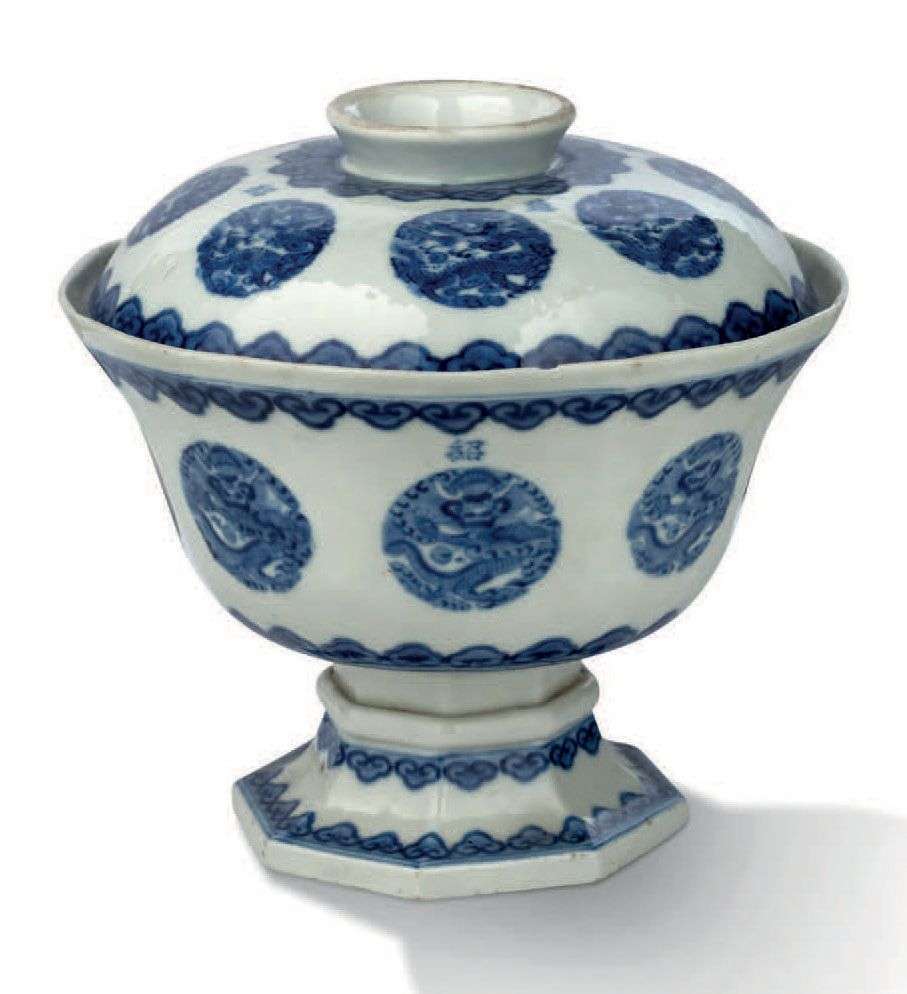 = Importante coupe couverte sur piédouche de forme octogonale en porcelaine bleu-blanc à décor de médaillons de dragons et frises de têtes de ruyi. La panse de la coupe et le couvercle avec les marques Thiêu Tri Niên Tao en bleu sous couverte.