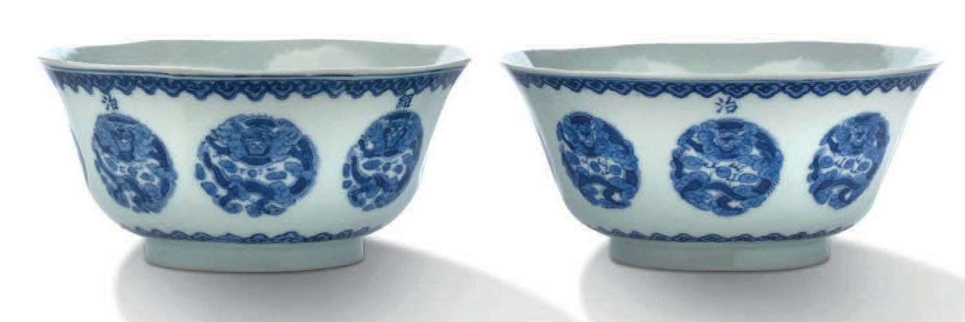 = Paire de coupes de forme octogonale en porcelaine bleu-blanc à décor de dragons impériaux dans des médaillons, la lèvre soulignée d'une frise de têtes de ruyi. Le corps avec une marque Thiêu Tri Niên Tao en bleu sous couverte.