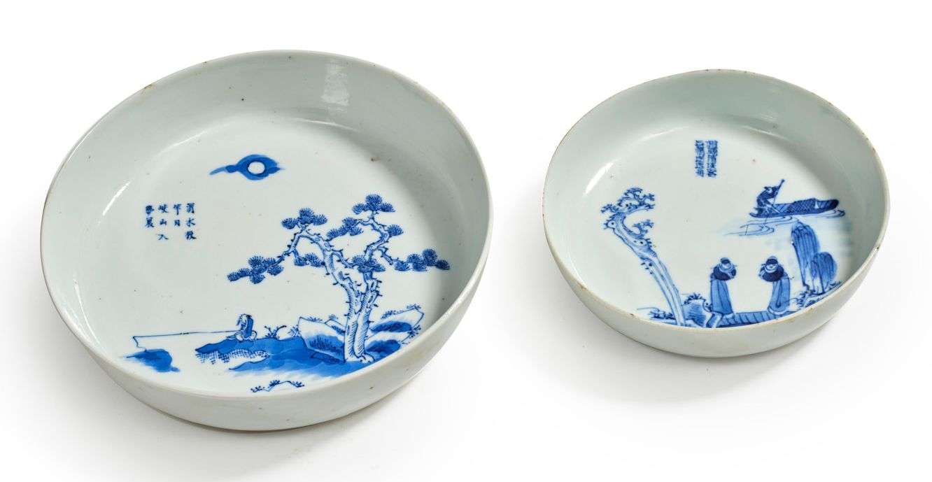 Ensemble de deux plateaux en porcelaine bleu-blanc à décor de paysages lacustres et poèmes, l'un peuplé d'un pêcheur et l'autre de deux dignitaires se saluant. La base du plus grand avec une marque Nuoc Tham