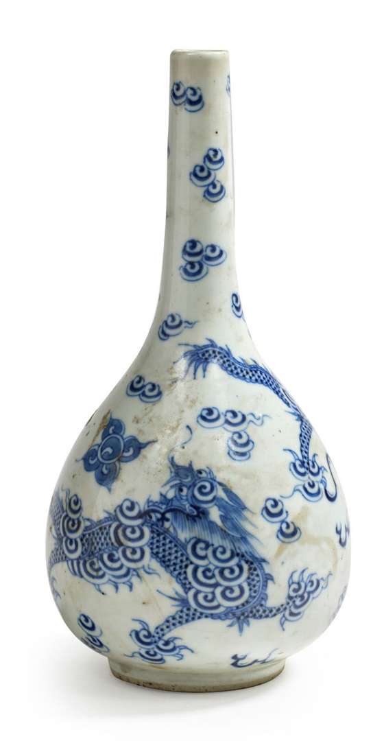 Vase bouteille en porcelaine bleu blanc, à décor de deux dragons pourchassant la perle sacrée dans les nuées et les flammes.