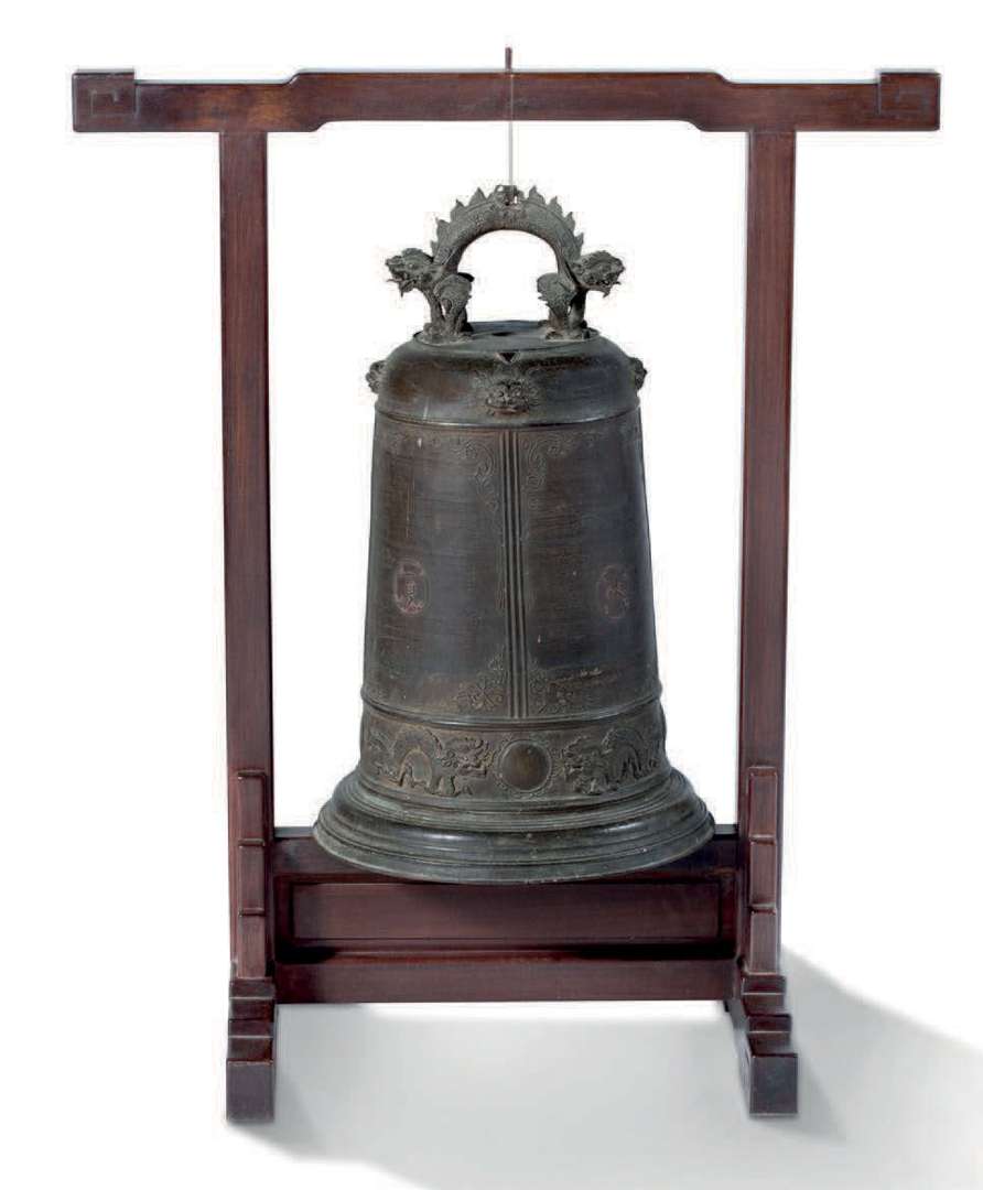 Cloche de temple en bronze à patine brune, le corps divisé en quatre registres décorés de médaillons avec les caractères des quatre saisons. L'ensemble encadré en partie supérieure des têtes de lions bouddhiques et par une frise de dragons passants en partie inférieure.