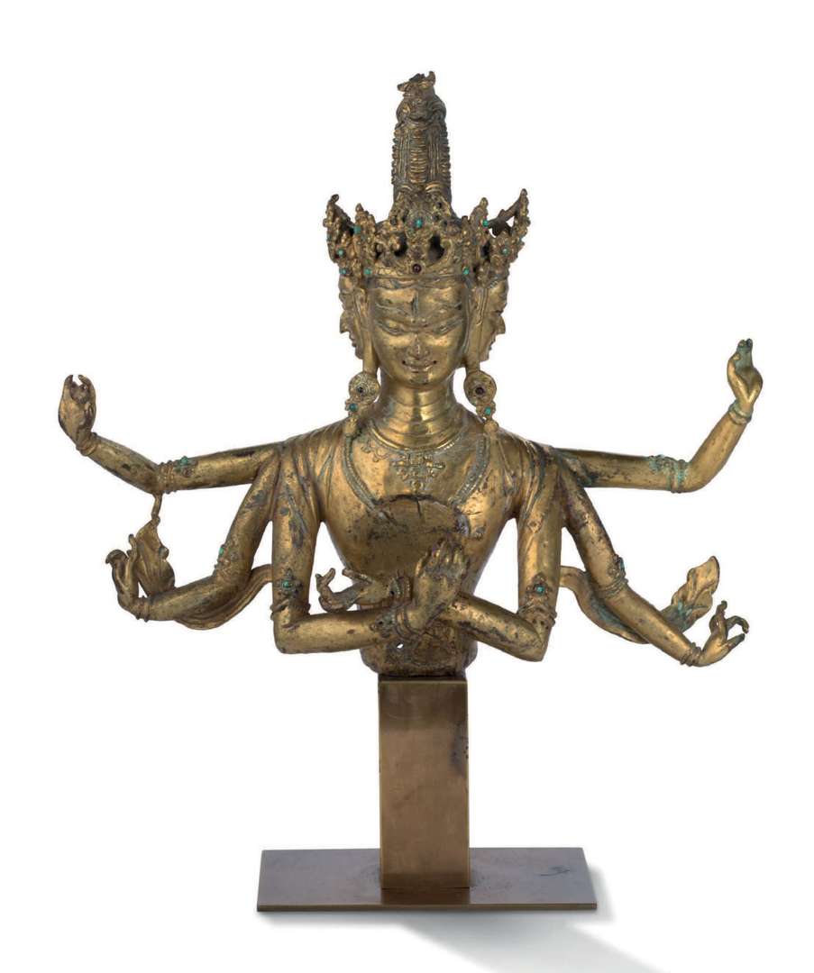 = Buste en alliage cuivreux doré figurant le yidam Guhyasamaja, ses bras principaux croisés devant la poitrine, les quatres autres bras rayonnants autour de son corps, vêtu d'écharpes flottantes et paré de nombreux bijoux avec des incrustations de pierres dures. Ses trois visages ceints de couronnes ouvragées, le chignon haut avec une petite effigie de bouddha. Avec son socle en métal doré.