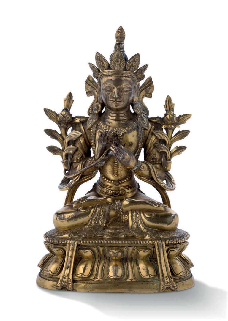 = Statue en alliage cuivreux doré représentant un bodhisattva, possiblement Manjusri, assis en vajrasana sur une double base lotiforme, les mains en dharmachakra mudra (mise en mouvement de la roue de la Loi Bouddhique), tenant des tiges de fleurs de lotus s'épanouissant près des épaules, vêtu d'un fin dhoti et richement paré de bijoux, le visage serein surmonté d'une couronne fleuronnée encadrant un chignon orné d'un joyau. La base scellée incisée d'un double vajra.