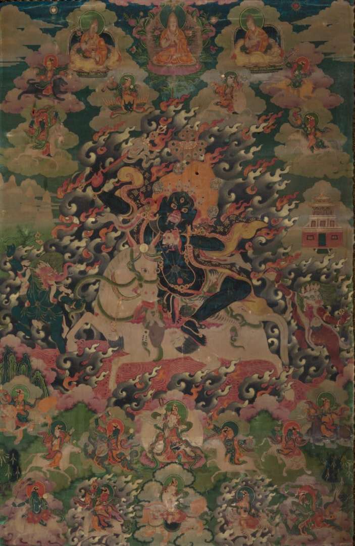 Grand thangka à l'encre et pigment sur toile représentant la dharmapala Palden