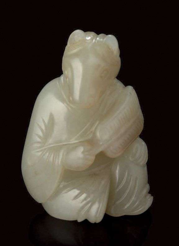 Petite sculpture en jade céladon figurant un cheval anthropomorphe, représenté assis vêtu d'une longue robe et tenant un éventail, personnification du signe zodiacal du cheval.