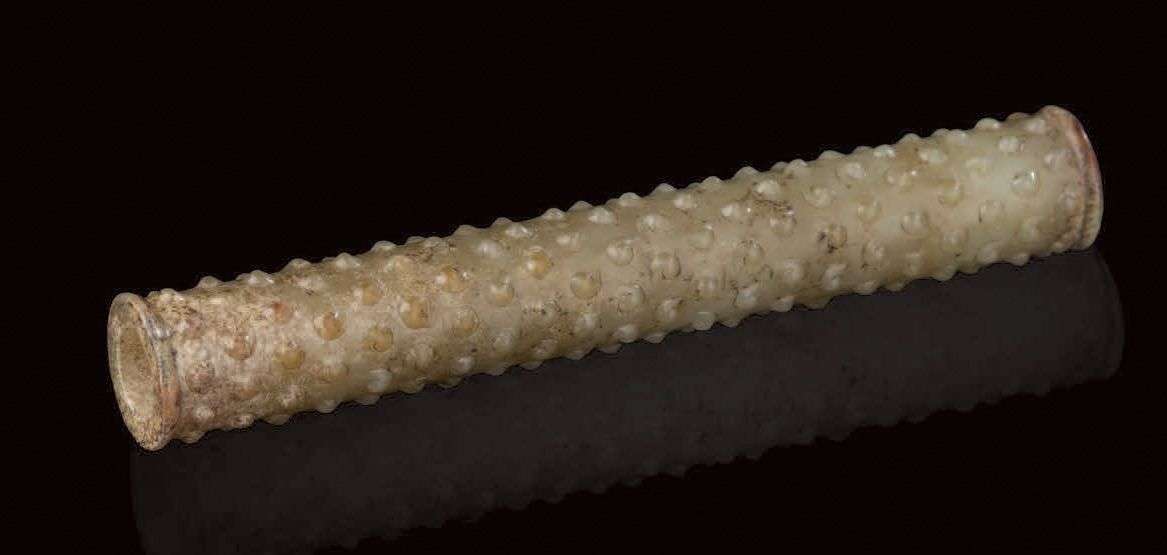 Tube en jade néphrite partiellement calcifié à décor de spirales dans le style de la dynastie Han.