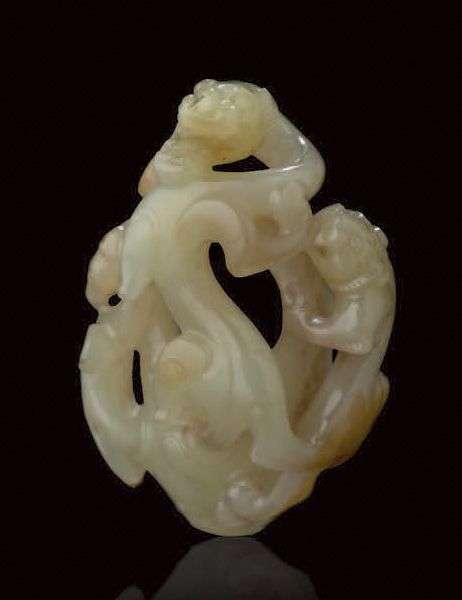 Pendentif en jade néphrite sculpté et ajouré à décor d'un oiseau mythique et deux chilong dans le style de la dynastie Han.