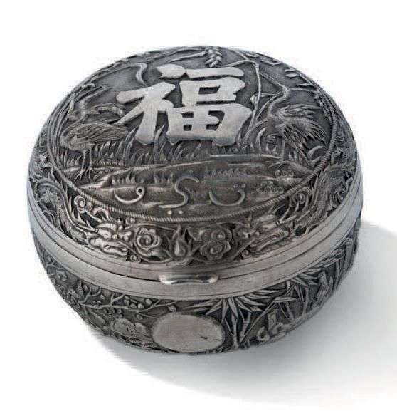 Petite boîte à pilules en argent repoussé décoré d'un caractère Fu (« Bonheur ») flanqué de deux grues, avec des inscriptions en caractères arabes et hébraïques.