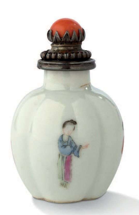 Flacon-tabatière de forme quadrilobée en porcelaine aux émaux de la famille rose à décor des personnages de « L'Histoire du