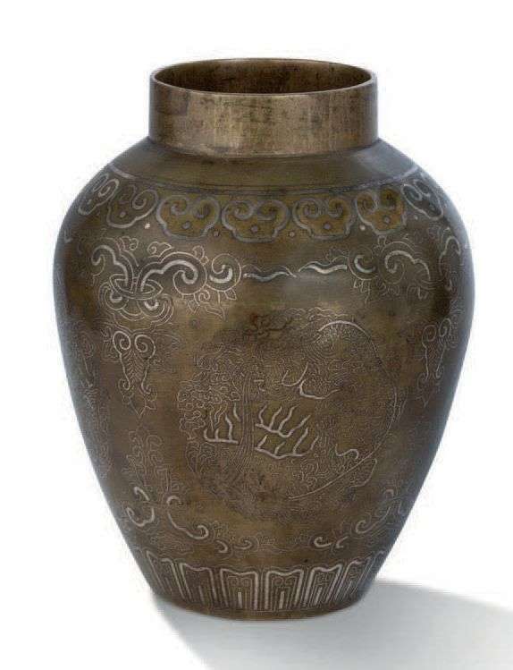 Pot de forme ovoïde en bronze à patine brune et incrustations d'argent, la panse décorée de médaillons peuplés de dragons parmi les nuées alternant avec des guirlandes stylisées. L'ensemble encadré par une frise de têtes de ruyi et une bande de pétales de lotus. La base avec une marque Xuande à quatre caractères.
