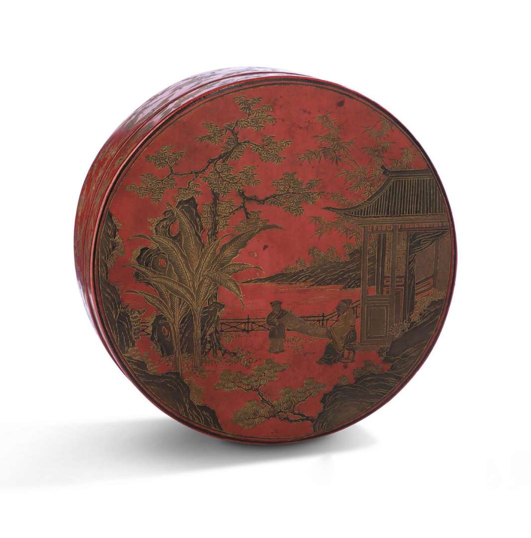 Boîte couverte ronde en laque gravée qiangjin sur fond rouge, le couvercle décoré d'un jardin où un lettré contemple un rouleau assisté d'un attendant. Les côtés ornés de papillons voletant parmi les prunus, chrysanthèmes, pivoines, bambous, champignons lingzhi, orchidées, oeillets... L'intérieur laqué noir.