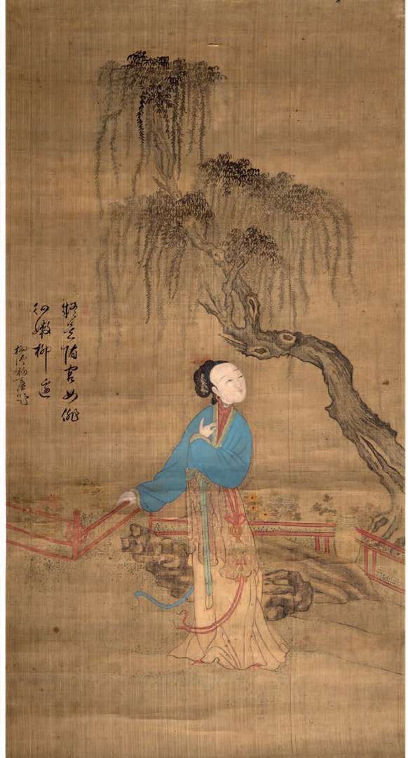Peinture à l'encre et couleurs sur soie montée en rouleau vertical représentant une dame de Cour sous un saule dans un jardin, avec un colophon en xingshu et deux sceaux à droite. L'inscription : « Serait-ce une dame d'honneur des Sui, Flânant près des tendres pousses du saule ? Calligraphié par Yang Chan, dit Gouffre aux saules. »
