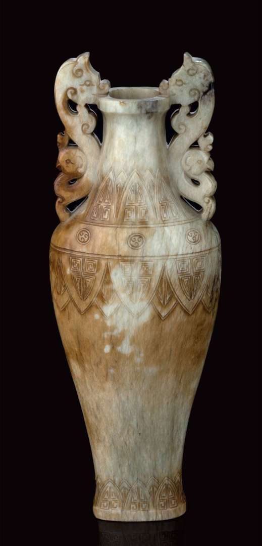 Vase de forme balustre en jade gris partiellement calcifié à décor sculpté et gravé de style archaïsant. L'épaule et le col soulignés par une frise de cigales stylisées. Le col flanqué de deux anses à têtes de chilong et phénix.