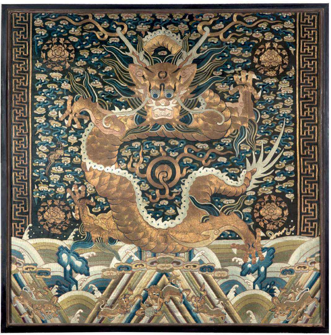 = Important panneau en satin de soie noir brodé aux fils polychromes et couchure de fils d'or représentant un dragon impérial, représenté de face, pourchassant la perle sur un fond de nuées peuplées de chauvesouris et médaillons de pivoines épanouies.
