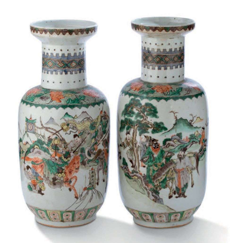 Paire de vases rouleaux en porcelaine aux émaux de la famille verte, le corps décoré d'une scène de bataille entre des cavaliers et des fantassins dans un paysage montagneux. La base avec une marque