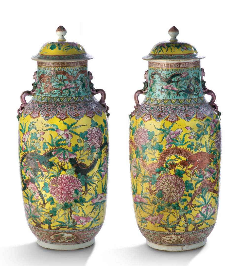 Importante paire de vases lanterne en porcelaine aux émaux de la famille rose, la panse avec un imposant décor sur fond jaune figurant deux dragons serpentant parmi les pivoines, chrysanthèmes et hibiscus.