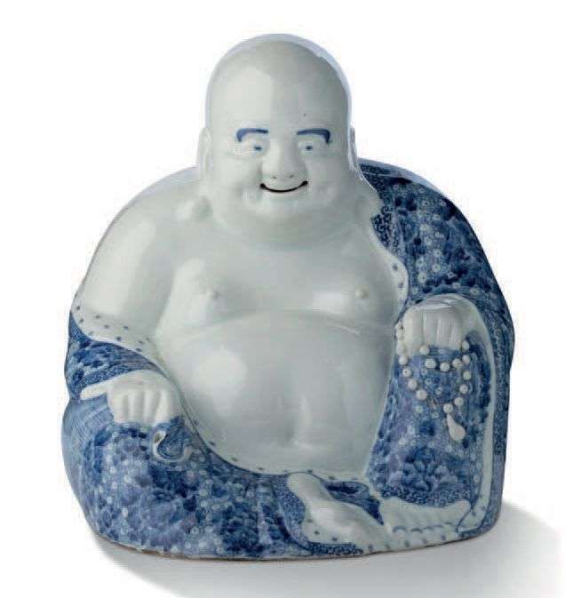 Importante statue en porcelaine bleu-blanc figurant Budai assis, l'expression rieuse, son large ventre denudé, portant un sac de chanvre. La base avec une marque