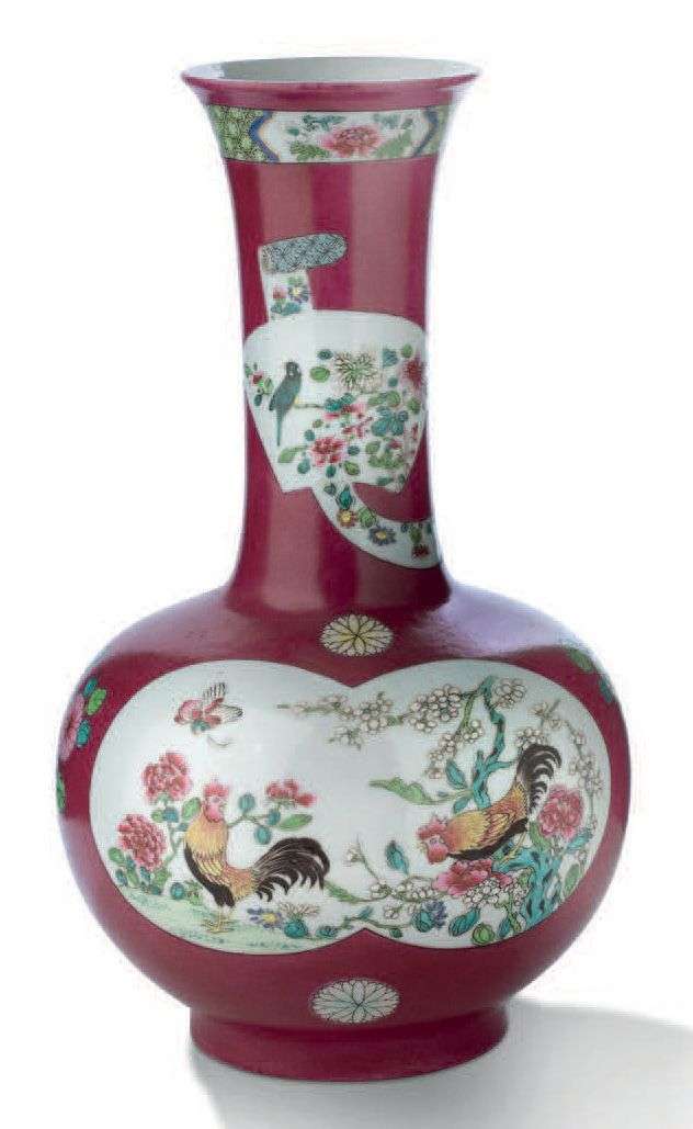 Vase en porcelaine aux émaux de la famille rose dans le style de la Compagnie des Indes, la panse décorée de deux réserves montrant des coqs parmi les fleurs, le col avec une réserve en forme de rouleau abirtant un oiseau branché. L'ensemble se détachant sur un fond émaillé rubis.