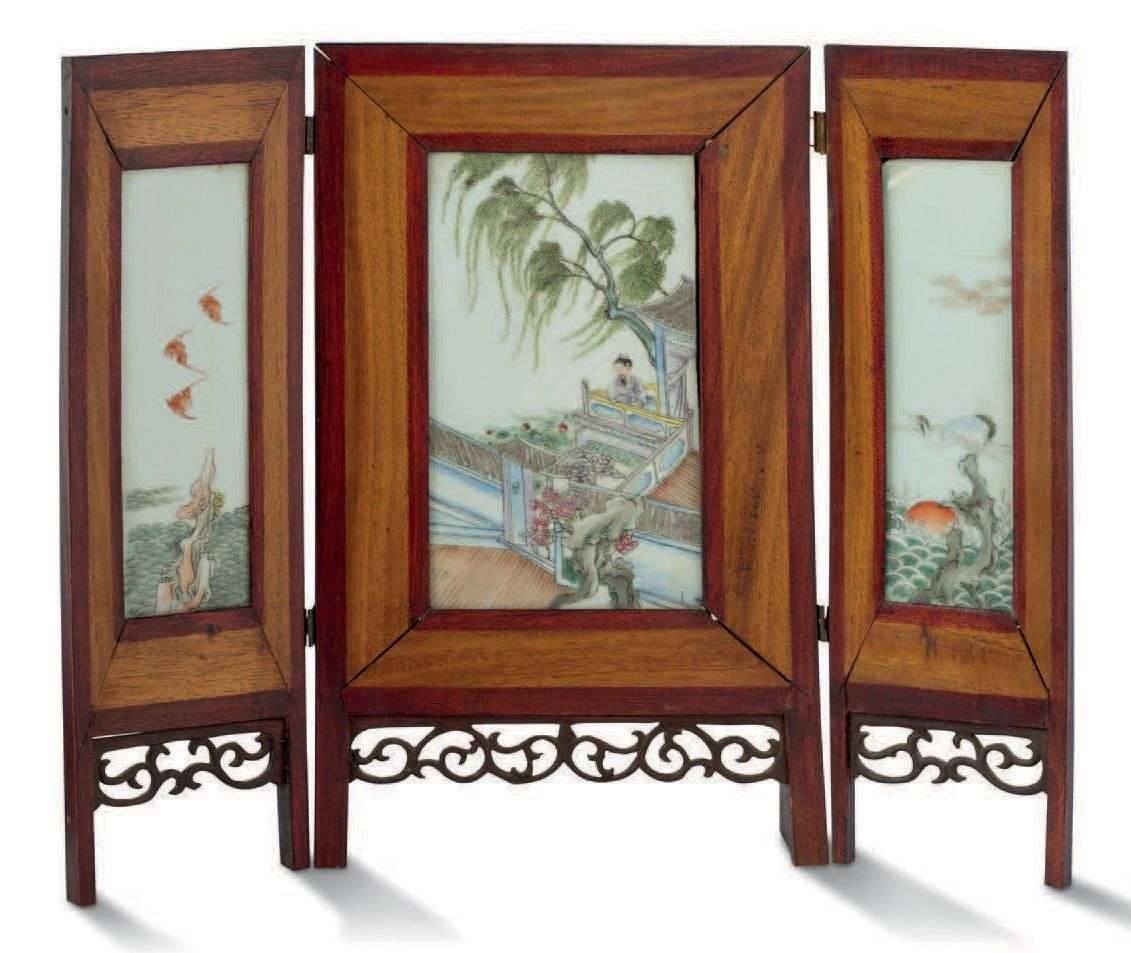 Petit écran de table à trois feuilles décorées de plaques de porcelaine aux émaux de la famille rose, la partie centrale figurant un lettré contemplant un lac depuis son palais, les deux autres plaques montrant une grue et des chauve-souris volant au-dessus des flots.