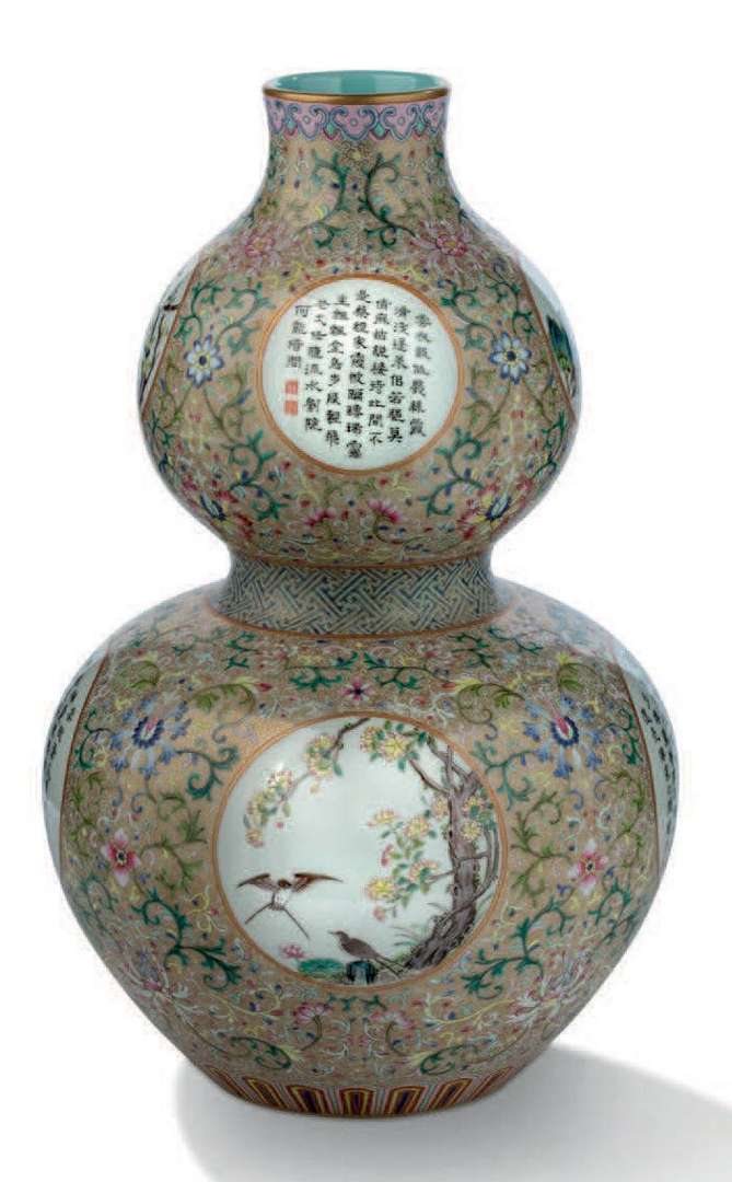 Vase double-gourde en porcelaine aux émaux polychromes et rehauts d'or, orné de huit médaillons circulaires alternant poèmes et paysages. L'ensemble se détachant sur un dense tapis de motifs spiralés à l'or et ponctué de rinceaux de lotus polychromes. La base émaillée turquoise avec une marque Qianlong à six caractères en zhuanshu en bleu sous couverte.