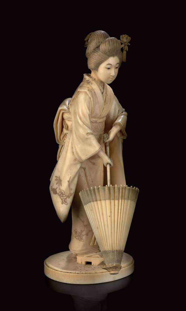 ~ Okimono en ivoire sculpté figurant une bijin, debout, vêtue d'un kimono décoré de branches de cerisier, coiffée d'un élégant chignon à coques rehaussé d'une épingle fleurie, ouvrant son ombrelle. La base avec un cachet gravé.
