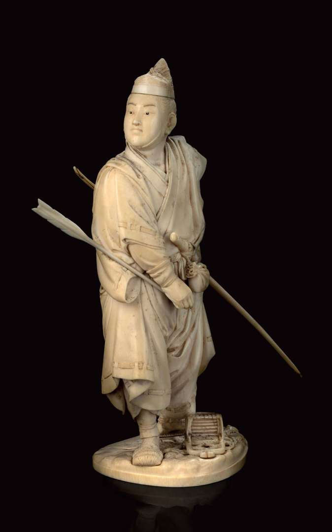 ~ Okimono en ivoire sculpté figurant un archer debout, aux aguets, tenant son arc dans la main droite et une flèche dans l'autre main.