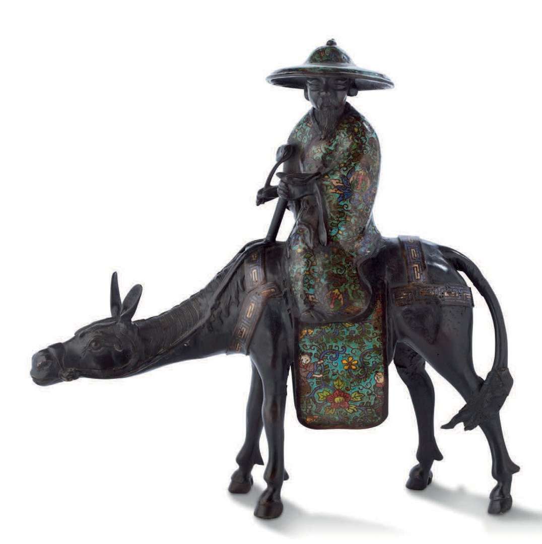 Statue en bronze à patine brune et émaux champlevés figurant Toba sur sa mule.