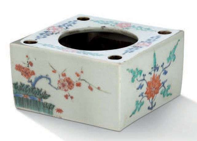 Rare encrier en porcelaine à décor Kakiemon, de forme carrée, les côtés décorés de branches fleuries et rinceaux de lotus.