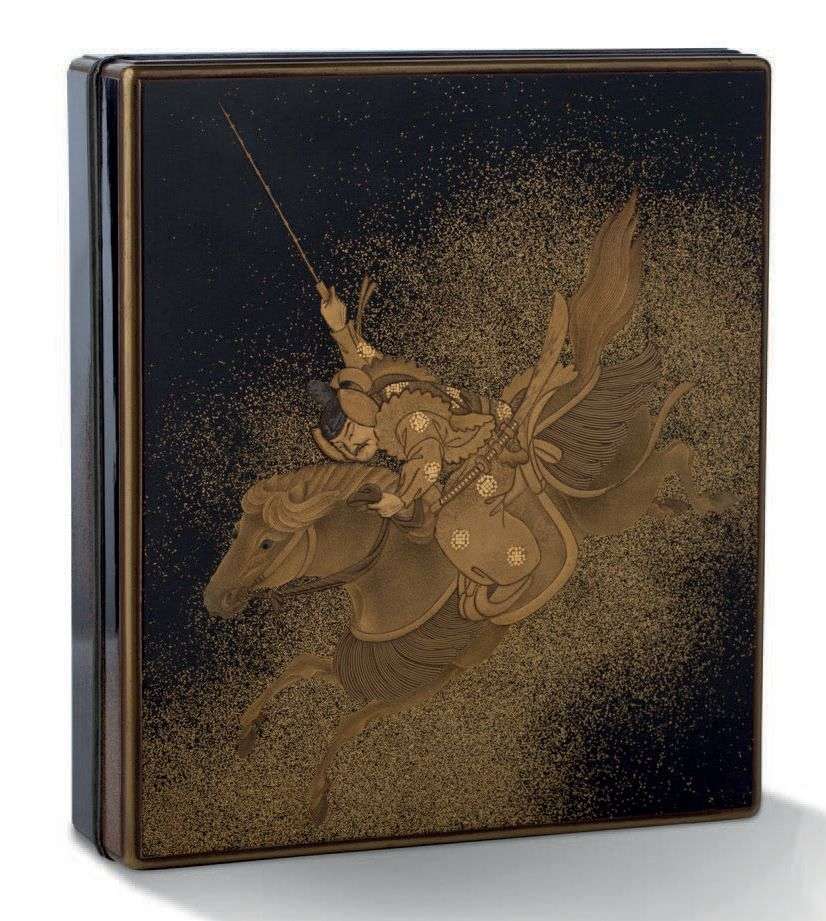 Suzuribako en laque hiramaki-e, takamaki-e, kirigane sur fond noir et dégradé de laque d'or décoré d'un cavalier et sa monture au galop, vêtu d'un costume de chasse de la période Heian. Le revers du couvercle décoré d'une composition avec son vêtement, son épée et sa coiffe kanmuri sur fond nashiji.