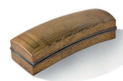 Petite boîte en laque hiramaki-e et takamaki-e imitant un koto à treize cordes, le fond à décor mokume imitant les veines du bois. La boîte et le couvercle avec un cerclage en étain.